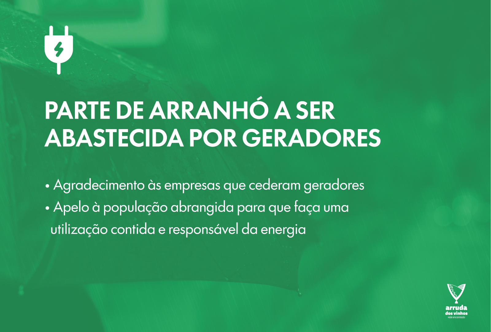 A Câmara Municipal de Arruda dos Vinhos agradece, de forma muito reconhecida, às empresas da freguesia de Arranhó que prontamente apoiaram o Município e, consequentemente, a população, através da cedência de geradores, contribuindo de forma decisiva para minimizar os constrangimentos provocados pela falta de energia elétrica.